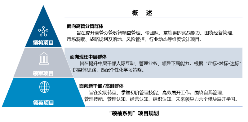在领导力发展及人才梯队建设方面,管理学院常年开展针对核心高管的“领将项目”、针对现任中层的“领军项目”、以及针对青干、中层后备、新干部的“领英项目”,同时,每年针对公司接力远东项目设计培养方案,从而逐渐搭建起从个人贡献者到组织贡献者的人才梯队。在 “领将项目”上,围绕核心高管的认知升级、开阔视野从而提升情境领导力,每年重点围绕经营管理、市场洞察、战略规划及落地、风险管控、行业动态等维度设计项目;在“领军项目”上,针对现任中层干部,从领导力提升和业务提升两方面着手,根据“定标-对标-达标”的整体思路,明确远东中层干部通用领导能力标准,引进ddi领导力课程体系,并高标准、严要求的进行人才测评选拔,重点培养有较高发展潜力的领导者,匹配个性化学习策略,沉淀学习教材教法等,通过打通人才选拔与任用环节,真正实现中层发展的闭环管理;在“领英项目”上,从文化认知、管理个人、管理他人三块面设计培养,通过课程 在岗训练的形式,实现新干部角色转型。在接力远东项目上,根据集团人力资源部对接力远东培养的整体要求,设计并组织系统的培养方案,内容涵盖文化理念融入、专业技能学习、职场心态转换及职业技能提升等系列课程,加速校招生融入远东。